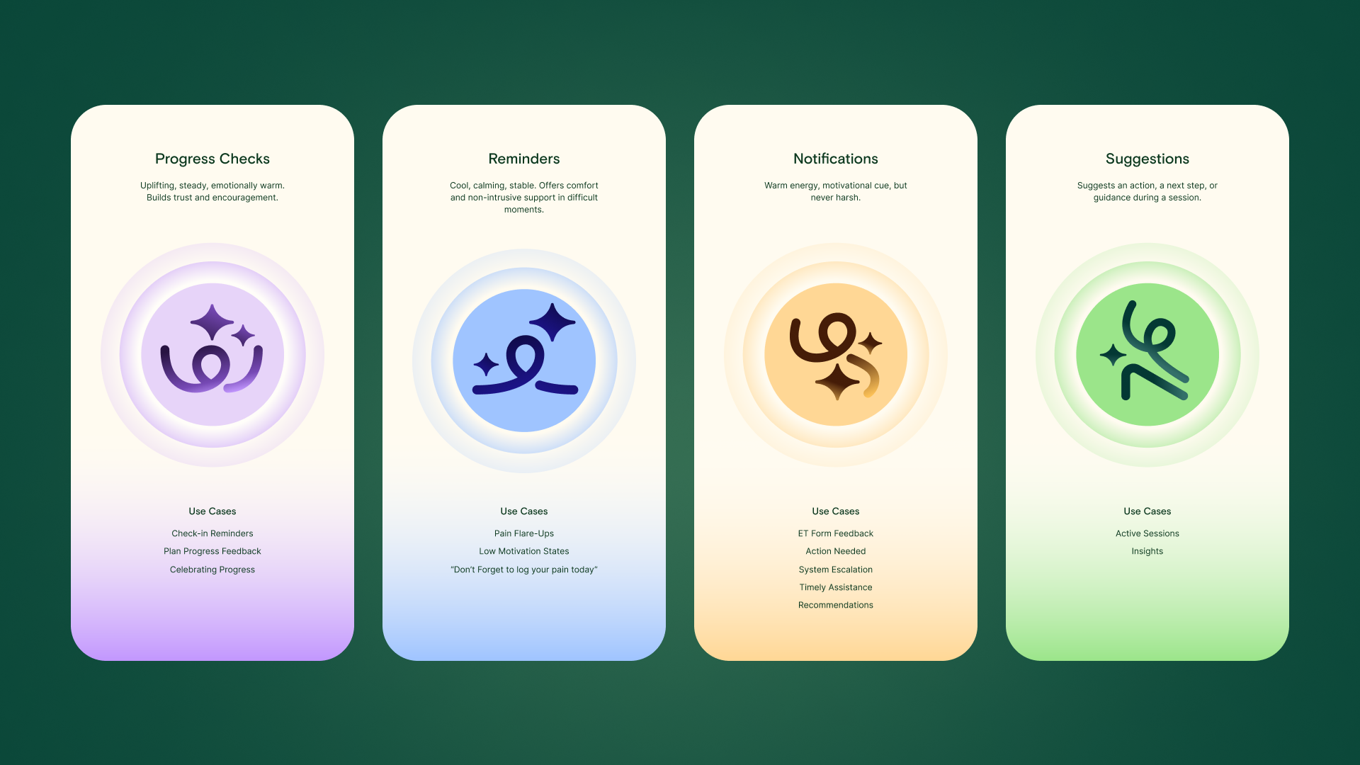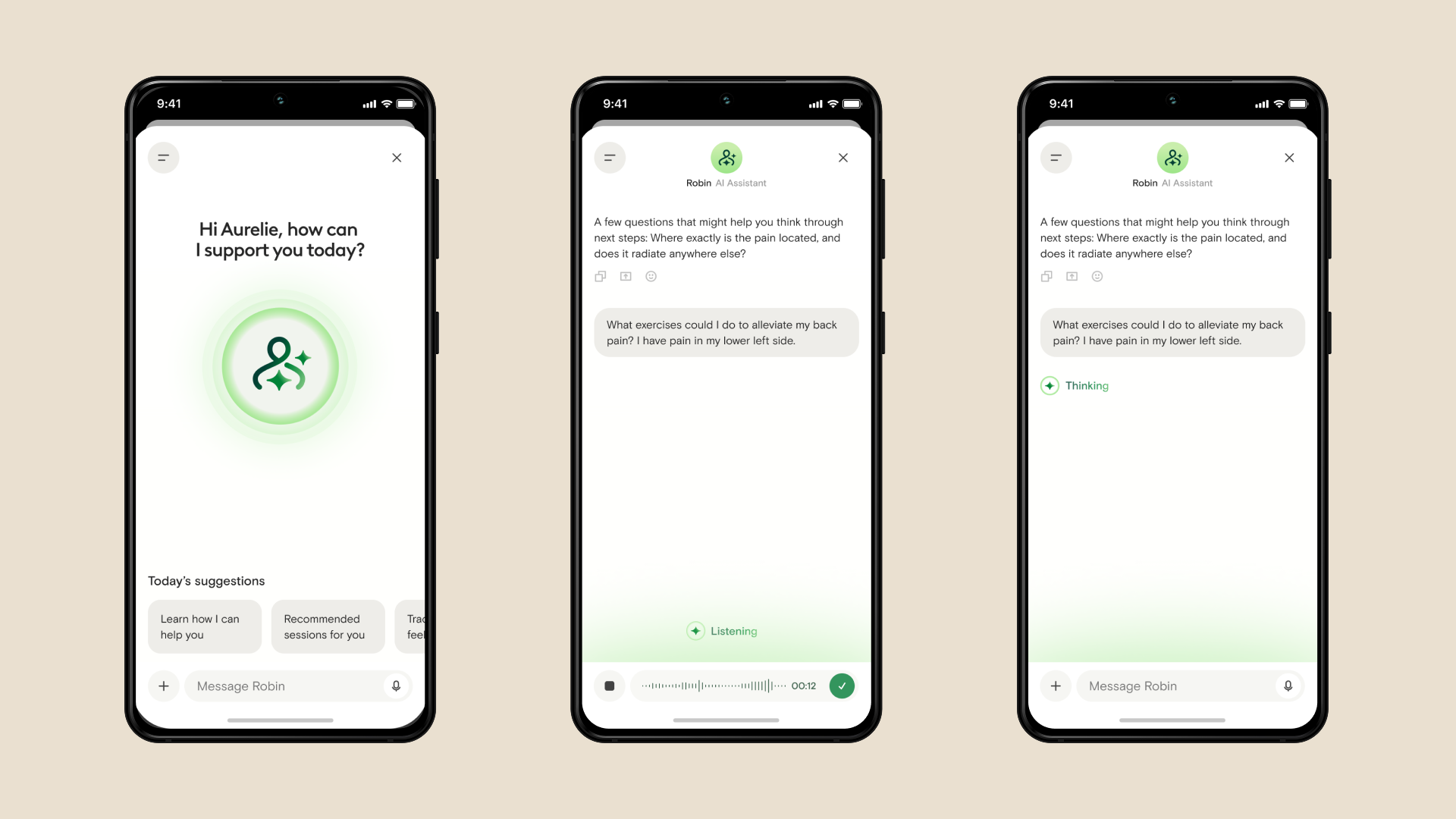 Robin wasn’t just another feature to integrate; it was the future of Hinge Health’s care experience. Yet, to fulfill that vision, it needed more than algorithms and insights. It needed warmth, empathy, and emotional intelligence. Our mission became clear: evolve Robin from “chatbot” to “caregiver.” We reimagined its purpose around human moments: where a nudge, a reflection, or a word of encouragement could change a member’s entire day. Robin would be present when it mattered most: guiding form during exercises, surfacing insights between sessions, and celebrating small wins with genuine emotion.