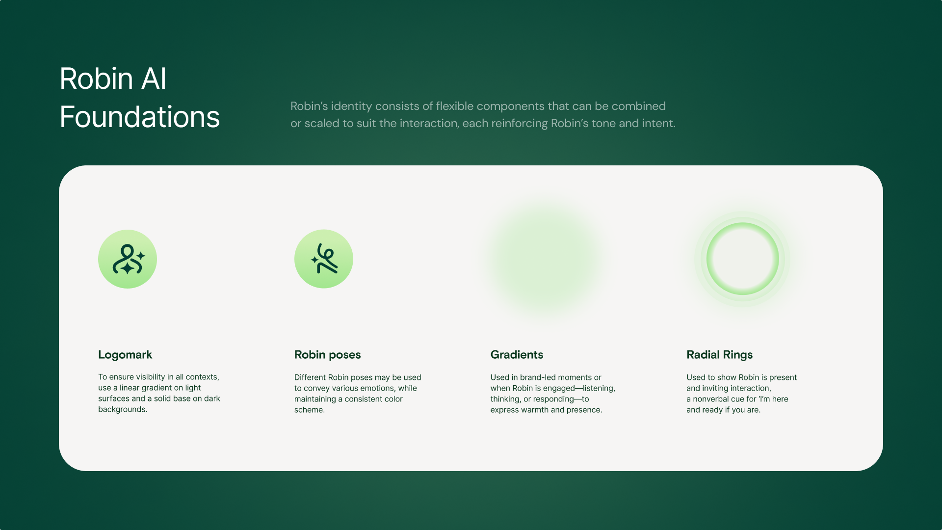 To make Robin’s intelligence scalable, we built a modular design system that defined how AI-driven states adapt across the app. Each pattern: “listening,” “thinking,” “suggesting”; came with clear behavioral and visual rules. This ensured that as Robin evolved, its presence would stay consistent, contextual, and trustworthy.