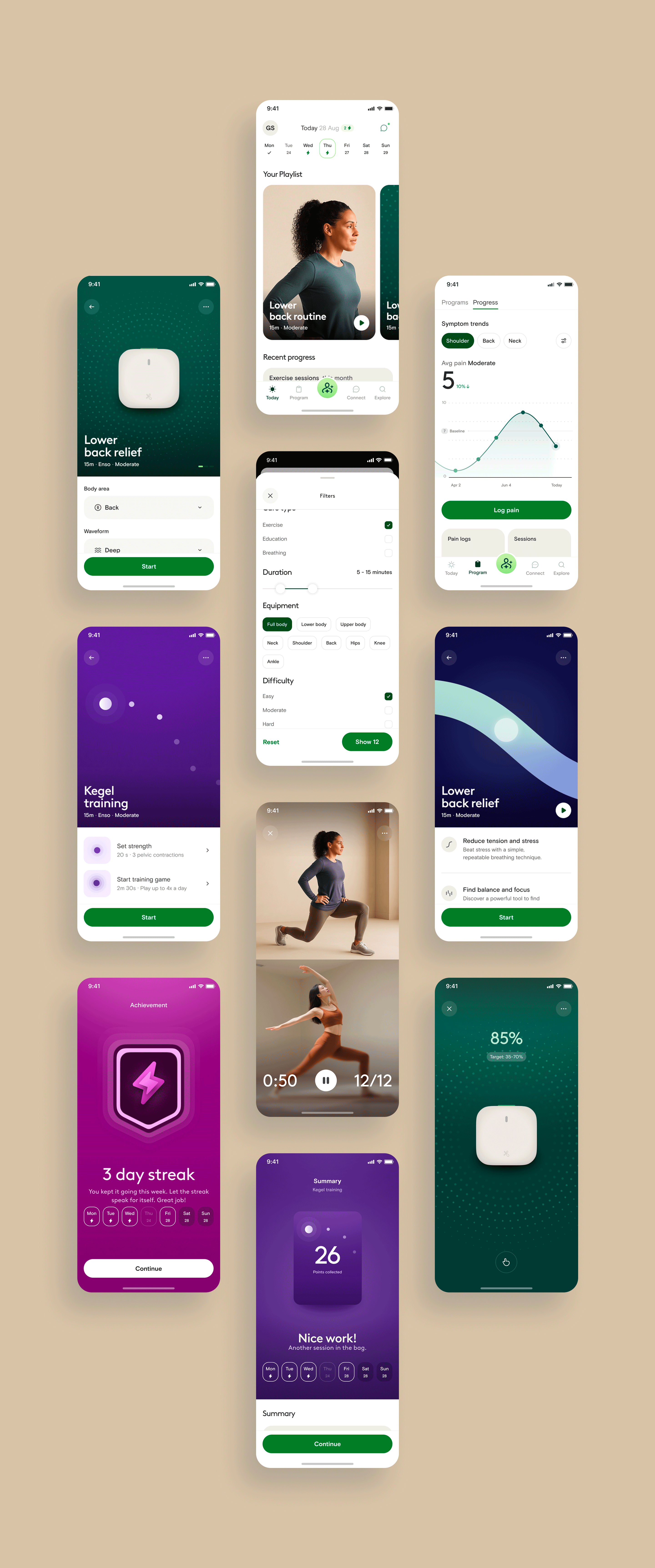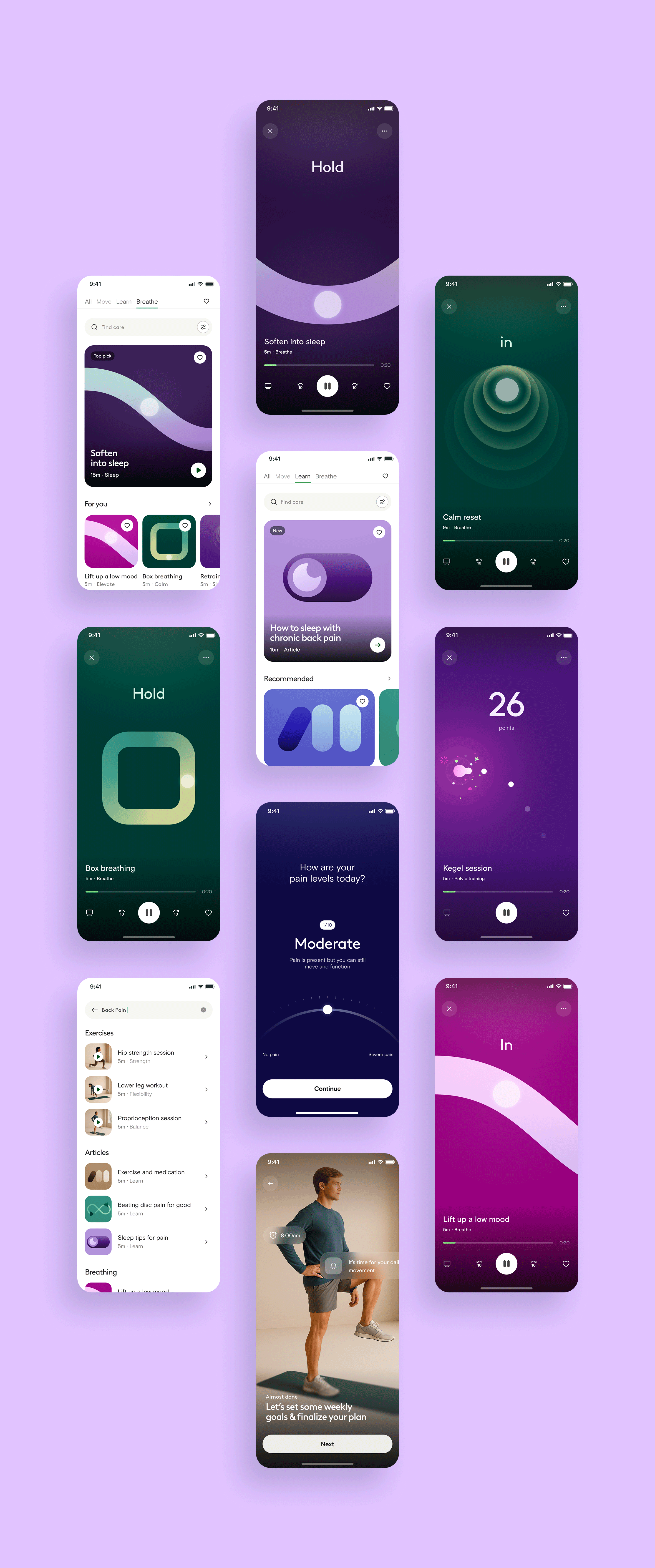 We reworked the user experience of our breathing exercises to make them more intuitive, engaging, and effective in helping members find calm and relief faster. The updated design emphasizes simplicity and guidance, making it easier to focus on breathing rather than navigating the app. With clearer visuals, smoother pacing, and personalized prompts, members can better connect mind and body during moments of stress or pain. This refreshed experience supports our goal at Hinge Health: to help people move, feel, and live better through treatments that address both the physical and psychological aspects of pain.
